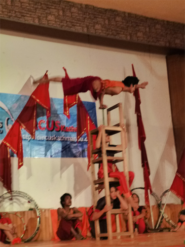 今回で二度目の企画。ショーの内容は、アクロバティックなダンス、組体操、プラフープ、ジャグリングなどで、全体的にプロとしてはまだまだという出来栄えなのですが、ネパールの文化的なお芝居、音楽などを盛り込んだ演出で楽しめました。バランス感覚や、筋力はしっかりと鍛えられています。海外からの指導者らの高度な技も披露され、一同、息をのんで見守りました。