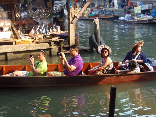 幅の狭い川の上には、幾そうもの観光用の小船が、ぶつかりながら行き交います。川岸から聞こえる売り子の声、写真を撮る観光客の姿、櫂が水を切る音と通り過ぎるモーターの音、地上とは違った風景が広がります。