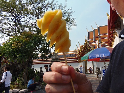 串に刺さったフルーツです。甘酸っぱくて果汁たっぷりのフルーツを食べると、なぜか元気が回復します。寺院の敷地内ではフルーツ以外の食べ物を売られていますが、ダントツ人気はこのフルーツ。そしてフルーツの中でもいちばん人気はパイナップル。切ったそばから次々売れていくので、お店の人も忙しそうです。