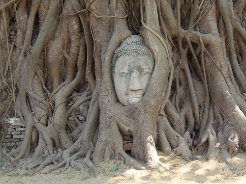 ワット・マハタートには、そんな仏像の頭のひとつが、木の根に抱かれるような形で残っています。