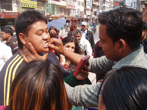 白い粉と液体を混ぜて、脱脂綿に含ませ歯を拭くと、きれいになる!ということです。セット販売で100ルピー。それが実際に次々と人が訪れ飛ぶように売れていました。