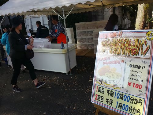 パンはコッペパンとぶどうパンがふたつ入って100円。販売時間は2回にわかれており、10時からと13時からです。10時の開門とともにすぐに行列ができて、あっという間に売り切れていました。そして、次回に売り出されるのを待つ行列もできているほどでした。