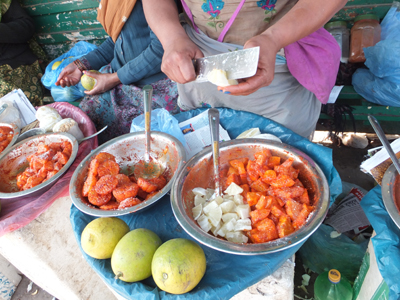 バス停の一角で調理販売されていたのは、真っ赤なミカン和え。正しくはミカンではないけれど、酸味とほろ苦さのある柑橘類です。