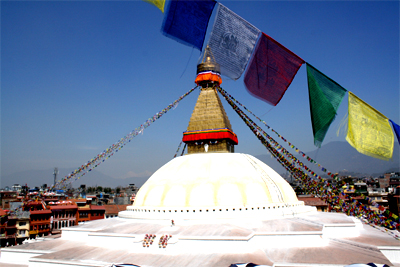 世界遺産の聖地ボウダナートの仏塔でも、タルチョーを掛け替えていました。仏塔の北側に階段が設置されていて、そこを1人で登って紐を切ったり、結んだり。見ている方が怖いです。