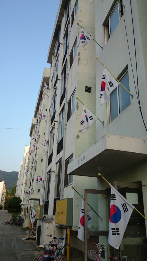 6月6日は亡くなった人を偲ぶ日であるため、国旗掲揚と言っても、弔旗を掲げることになります。ちょうどその6月6日に、ソウル松坡区の職業軍人官舎にお邪魔する用事がありました。国を守るという職業柄、この軍人アパートでは全宅、そしてアパートの入り口ごとに弔旗が掲げられていました。