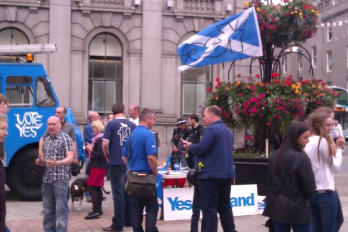 街の一番賑やかな場所で、独立賛成に投票するように呼びかけています。