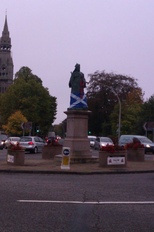交通量の多い交差点に立つ彫像に、スコットランドの国旗が貼られました。