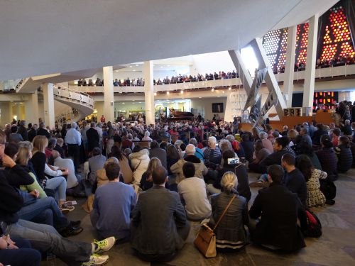 このコンサートはホールではなく、一回のロビーの空間にちょっとした舞台を設置して行われます。観客席はごくわずかで大半の人は立っていたり、階段や地べたに座っていたり、またはロビー後方にある食堂でランチを食べながら音楽を楽しむ人たちもいます。
