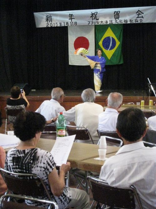 初めに、先駆者の霊に1分間の黙とうの後、日伯両国歌を全員で斉唱。続いて大沼 宜信同協会会長が「おめでとうございます。昨年は創立95周年式典などで皆様には大変お世話になりました。今年は3月総会で新役員が決まり、4年後には100周年を迎えるので委員会を設置します。皆で頑張りましょう」とあいさつ。杉本 正さん(98)=上常呂出身=の乾杯の音頭で、全員が今年の弥栄と無事を祈った。懇親会では軽音楽演奏や日本舞踊の祝いの舞が披露され、来場者は熱心に見入っていた。