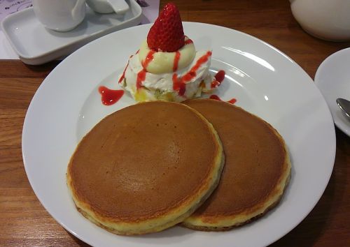 流行のパンケーキではないので、フワフワや口で溶けるということではありませんが、ギュっと焼かれていてホットケーキらしい味わいです。クリームはコクがあってとてもおいしいですし、中のフルーツがとにかく新鮮。シャキシャキとしたりんごの歯ごたえや、バナナの甘味などそれぞれの果実の特徴を楽しめるクリームでした。これだけおいしいと、パフェもきっとおいしいはずと確信しました。次回はパフェを試してみたいと思います。
