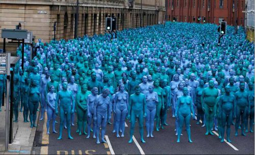 先日、7月9日はイギリスの市内中心部での撮影が行われました。海をテーマにしたものでした。被写体はみんな全身をブルーにペイントし、撮影をおこなったことで、ニュースでもネットでも話題になりました。この作品は、2017年にギャラリーで発表される予定だそうです。
