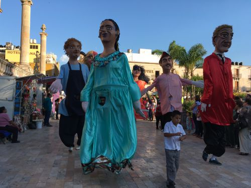教会の西側にある市役所から出てきたのは、20体ほどの3.5メートルサイズと10体ほどの1.5メートル子どもサイズ。少し調子が外れたのどかな村の楽隊を先頭に、練り歩きが始まります。革命の父イダルゴ神父やサッカー選手、あの有名なクマさん?のようなモヒガンガをかぶった踊り子たちは、楽団の音楽に乗って踊りながら飛び跳ねたり、でんでん太鼓のように腕を左右に振り回したりしています。