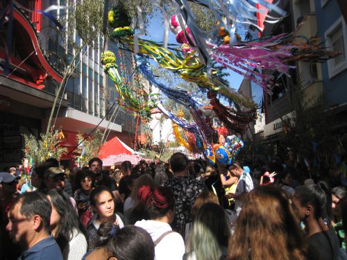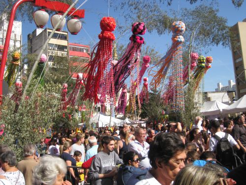 41回を数える同祭りは、当初、ブラジル宮城県人会が中心になって始まり、近年は東洋街の商工会が運営してきた。会場は、地下鉄「ジャパン・リベルダーデ駅」に続くリベルダーデ広場からメイン通りのガルボン・ブエノの区域。およそ40本の色鮮やかな飾りが吊り下げられ、そよ風にサラサラと音を立てて揺れていた。