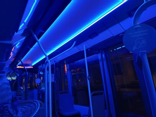 パリ市内を走るバスの車内のLEDから発せられる青色光。撮影2025年11月